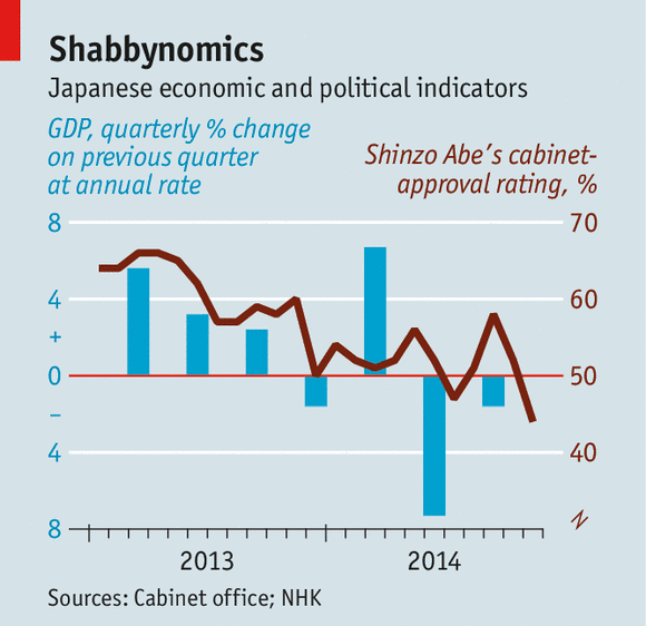 The newly published data showed that GDP had shrunk by 1.6% on an annualised basis in the third quarter (see chart). This followed a contraction of 7.3% in the second quarter that many blamed on an initial rise in the consumption (value-added) tax, from 5% to 8%, in April. That made it easy for Mr Abe to delay the next tax hike until April 2017, when nothing short of a full-blown financial crisis, he pledged, would prevent a further rise—vital, as the fiscal conservatives see it, to repairing Japan’s parlous public finances.